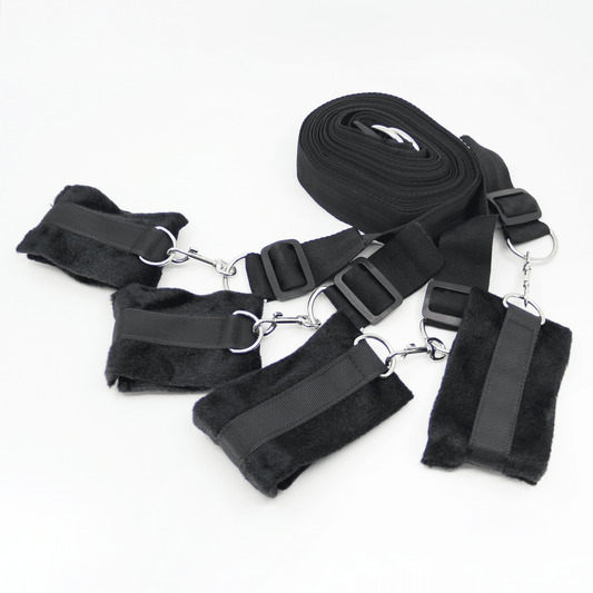 Transform any bed into a wonderland of fun and let the games begin! The durable nylon tethers connect to 4 super soft neoprene-lined cuffs, which easily adjust to securely hold your partner in place. These under mattress bed bindings open a world of possibilities for you and your lover. Just secure under the mattress to enjoy. Explore your deepest fetish fantasies!